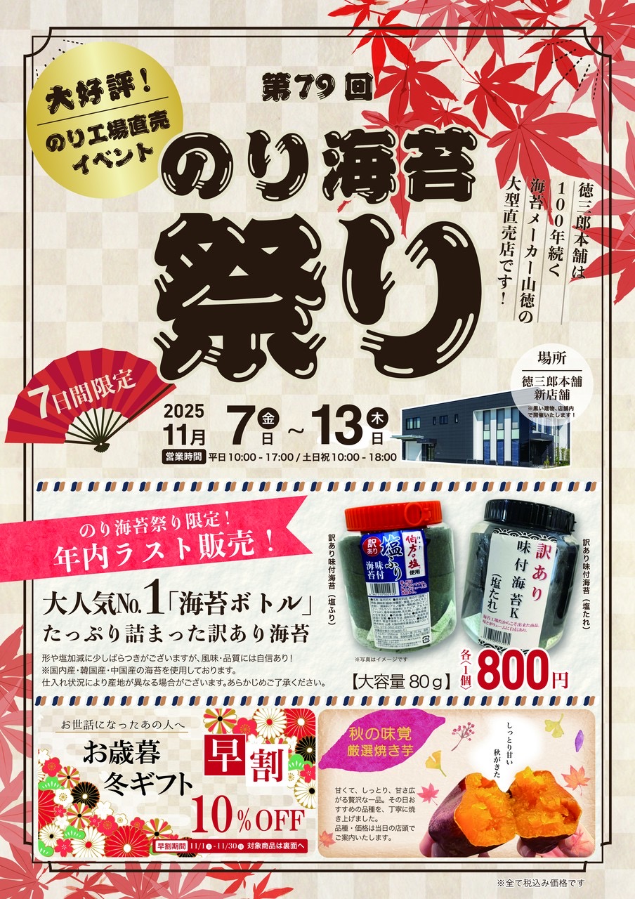 次回の〈のり海苔祭り〉は【2025年11月7日(金)~11月13日(木)】開催の予定となっております。皆様のお越しをスタッフ全員でお待ち申し上げております。